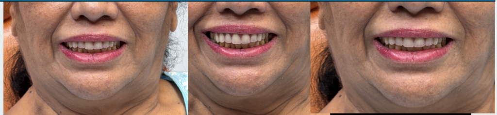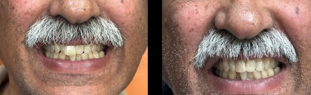 These images showcase the remarkable transformation achieved through single-stage immediate load cortico-basal dental implants. In the “before” photo, the patient’s smile appears closed and aged due to missing teeth, reflecting the challenges many face with tooth loss. In the “after” photo, the patient’s smile is beautifully restored with clean, well-aligned artificial teeth, instantly rejuvenating facial appearance and confidence. This treatment not only replaces missing teeth but also brings back the joy of smiling, speaking, and eating comfortably—all within just a few days.